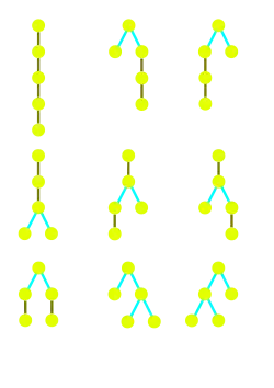 Le nombre de Motzkin est aussi le nombre d'arbres unaires-binaires (c'est-à-dire d'arbres planaires enracinés où chaque nœud a un ou deux enfants) à arcs. On peut voir cela directement, par interprétation de la relation de récurrence, ou aussi en établissant une bijection entre les cercles à cordes et ces arbres. Choisissons à nouveau un point sur un cercle. S'il n'est pas lié par une corde, on lui fait correspondre la racine d'un arbre avec un seul fils qui correspond au cercle fusionné. Sinon, la corde découpe le cercle en deux parties, correspondant aux sous-arbres gauche et droit d'un arbre dont la racine a deux fils.