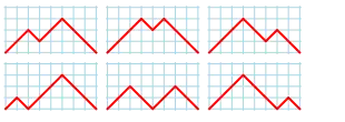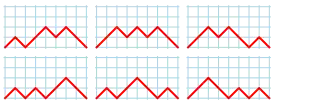 Si l'on représente un parenthésage par un chemin de Dyck, le nombre compte les chemins de Dyck de longueur qui ont exactement pics, c'est-à-dire de pas montants suivis immédiatement d'un pas descendant. Les figures suivantes représentent les chemins comptés par les nombres :