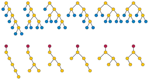 Le n-ième nombre de Wedderburn-Etherington est le nombre d'arbres binaires stricts enracinés à feuilles (chaque nœud interne possède deux fils), deux arbres étant considérés comme identiques dès que l'on peut passer de l'un à l'autre par des symétries par rapport à des axes verticaux issus des nœuds[1] (sans ces identifications, on obtiendrait les nombres de Catalan). C'est aussi le nombre d'arbres (faiblement) binaires (où chaque nœud interne possède un ou deux fils) ayant nœuds, avec les mêmes identifications que précédemment.