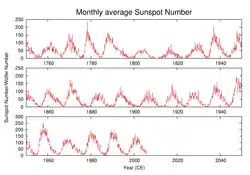 Lors du cycle 19, le nombre de Wolf a atteint 190 tandis qu'il n'a pas dépassé 70 lors du cycle 14. Malgré son imprécision, le nombre de Wolf a l'intérêt d'exister depuis 250 ans tandis que l'observation scientifique avec des moyens modernes n'a que quelques cycles dans ses bases de données.