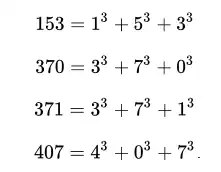 - Les dix termes suivants de la suite des 88 nombres narcissiques (suite A005188 de l'OEIS) sont 153, 370, 371, 407, 1 634, 8 208, 9 474, 54 748, 92 727 et 93 084.