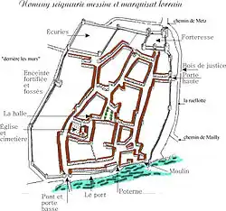 - Forteresse (XIe) et château[30],[31](XIVe) des évêques de Metz. Les vestiges se limitent à ceux de trois tours, du châtelet et des quatre courtines de la forteresse. Du château, il ne reste que la cour pavée dont seule la moitié nord a été mise au jour. Les ruines y compris le sol sont classées au titre des monuments historiques par arrêté du [32].