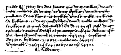 « … item noctes que le premier greton dembas vault ung, le second vault [sic] cent, le quart vult mille, le Ve vault dix M, le VIe vault cent M, le VIIe vault Milion, Le VIIIe vault dix Million, Le IXe vault cent Millions, Le Xe vault Mill Millions, Le XIe vault dix mill Millions, Le XIIe vault Cent mil Millions, Le XIIIe vault bymillion, Le XIIIIe vault dix bymillions, Le XVe vault [sic] cent bymillions, Le XVIe vault mil bymillions, Le XVIIe vault dix Mil bymillions, Le XVIIIe vault cent mil bymillions, Le XIXe vault trimillion, Le XXe vault dix trimillions … »