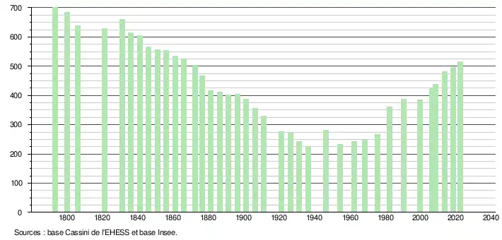 L'évolution du nombre d'habitants est connue à travers les recensements de la population effectués dans la commune depuis 1793. Pour les communes de moins de 10 000 habitants, une enquête de recensement portant sur toute la population est réalisée tous les cinq ans, les populations de référence des années intermédiaires étant quant à elles estimées par interpolation ou extrapolation[27]. Pour la commune, le premier recensement exhaustif entrant dans le cadre du nouveau dispositif a été réalisé en 2008[28].