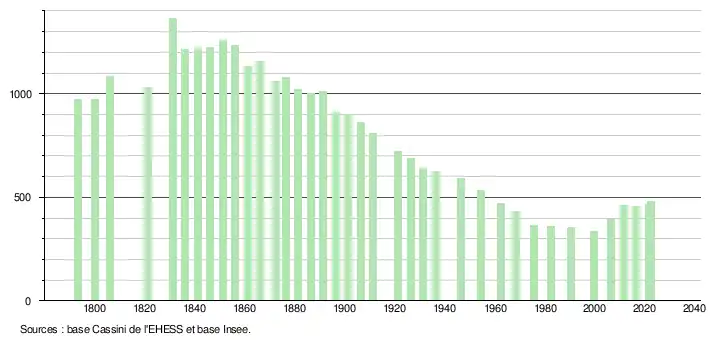 | L'évolution du nombre d'habitants est connue à travers les recensements de la population effectués dans la commune depuis 1793. Pour les communes de moins de 10 000 habitants, une enquête de recensement portant sur toute la population est réalisée tous les cinq ans, les populations de référence des années intermédiaires étant quant à elles estimées par interpolation ou extrapolation[27]. Pour la commune, le premier recensement exhaustif entrant dans le cadre du nouveau dispositif a été réalisé en 2006[28]. En 2022, la commune comptait 478 habitants[Note 3], en évolution de +5,29 % par rapport à 2016 (Corrèze : −0,59 %, France hors Mayotte : +2,11 %). |