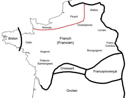 Le normand (normaund ou nourmaund en normand) est une langue d'oïl parlée en Normandie continentale et insulaire. Il est classé dans les langues sérieusement en danger par l'Unesco et se divise en deux principales variantes : le normand du nord et le normand du sud. Cette distinction repose sur la ligne Joret, qui sépare les parlers du nord et du sud de la Normandie[1],[2]. Le normand parlé au nord de cette ligne présente des caractéristiques propres qui le font différer grandement du français standard, notamment dans le maintien du son [k] latin devant [a] là où le français l'a fait évoluer vers [ch] (d'où l'opposition entre vache et vaque, chien et kien)[2]. En revanche, à mesure qu'on descend dans l'Orne et qu'on se rapproche des parlers du Centre, ces caractéristiques s'estompent et les parlers ressemblent davantage au français[1]. Ces différences reflètent l’histoire linguistique complexe de la région, marquée par des influences romanes et scandinaves[3].