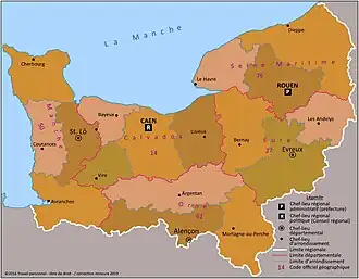 La région Normandie en tant qu'entité administrative a été créée le . Elle résulte de la fusion des anciennes régions Basse-Normandie et Haute-Normandie, régions créées en 1972[4]. La région est formée des cinq départements normands fondés par le décret du 22 décembre 1789, et dont la somme correspond aux limites de la Normandie historique, à l'exception de quelques communes limitrophes, et augmentée d’une partie du comté du Perche, ancienne province du royaume de France, ajouté au département de l'Orne lors de sa création.