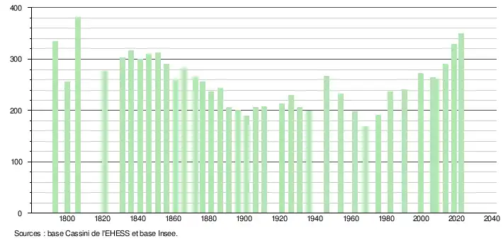 L'évolution du nombre d'habitants est connue à travers les recensements de la population effectués dans la commune depuis 1793. Pour les communes de moins de 10 000 habitants, une enquête de recensement portant sur toute la population est réalisée tous les cinq ans, les populations de référence des années intermédiaires étant quant à elles estimées par interpolation ou extrapolation[25]. Pour la commune, le premier recensement exhaustif entrant dans le cadre du nouveau dispositif a été réalisé en 2008[26].