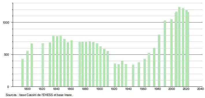 L'évolution du nombre d'habitants est connue à travers les recensements de la population effectués dans la commune depuis 1793. Pour les communes de moins de 10 000 habitants, une enquête de recensement portant sur toute la population est réalisée tous les cinq ans, les populations de référence des années intermédiaires étant quant à elles estimées par interpolation ou extrapolation[22]. Pour la commune, le premier recensement exhaustif entrant dans le cadre du nouveau dispositif a été réalisé en 2005[23].