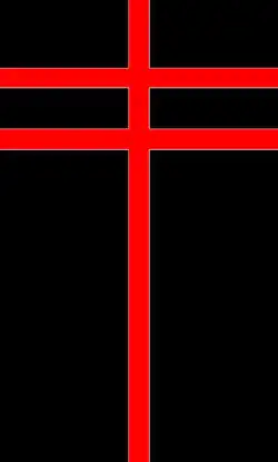 Ensuite, la Croix de saint Georges rouge est conservée, mais une seconde branche horizontale lui est ajoutée, formant une sorte de croix de Lorraine dont les deux branches sont de longueur égale. La croix de Lorraine peut aussi être une référence inversée à l'insigne de la France libre, sous la conduite du général de Gaulle, qui combattit le Troisième Reich aux côtés du Royaume-Uni durant la Seconde Guerre mondiale de 1940 à 1943. Sur les cocardes des avions militaires de la France libre, la croix de Lorraine était également rouge et inscrite dans un cercle blanc.