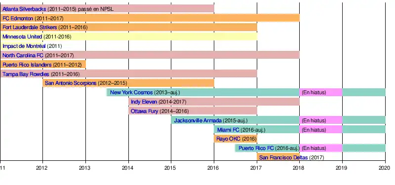 Après la saison 2014, la nouvelle franchise d'expansion de Jacksonville, l'Armada de Jacksonville entre à son tour dans la ligue pour la saison 2015[17]. La franchise initialement prévue pour 2015 du Oklahoma City FC (Oklahoma City) est rachetée par le club espagnol du Rayo Vallecano[18] qui crée ensuite une nouvelle franchise dans la ville le , sous le nom de Rayo OKC. Cette nouvelle franchise intègre la ligue pour la saison 2016[19].