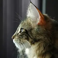 Les oreilles sont grandes, larges à la base et placées dans le prolongement du triangle formé par la tête. Elles peuvent se terminer par une touffe de poils à la manière des oreilles du lynx, qui est appréciée sans être obligatoire. Des oreilles trop petites ou trop rapprochées sont considérées comme un défaut pénalisant (mais cependant pas éliminatoire)[11].