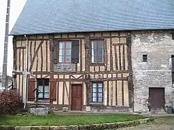 Le logis est partie en pan de bois, partie en pierre de taille calcaire de moyen appareil, avec essentage d'ardoise en pignon. Le mur sur rue des dépendances en alignement est en pierre de taille calcaire de moyen appareil, le pignon a des bandeaux de brique et les murs sur rue sont en blocage de silex blond avec chaînes calcaire et essentage de planche à la partie supérieure.