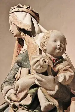 La Vierge est sculptée selon une structure pyramidale, que vient rompre l’enfant Jésus. En effet, ces deux éléments sculpturaux semblent autant s’opposer qu’ils sont liés. D'autre part la rondeur du visage de l’Enfant contraste avec le visage triangulaire de sa mère. Le jeu contrasté de couleurs entre le bleu associé par convention à la Vierge et le rouge de l’Enfant est habituel à la fin du Moyen Âge. Leurs regards opposés créent un effet de mouvement, renforcé par les courbes du drapé. Ce mouvement est également suggéré par les jeux du sculpteur sur les plis. En effet, les plis anguleux (comme à l’avant de la robe), côtoient les replis souples (comme à la base de la statue). Le sculpteur a aussi joué sur l’ombre et la lumière par un travail sur la profondeur des plis, qui contrastent avec la lumière de plages plus lisses, comme celle qui vient suggérer le genou droit de la Vierge. Ces jeux de contrastes dû à la virtuosité du sculpteur, donnent du volume à la Vierge et viennent appuyer l'effet de mouvement. Il s'agit en outre d'une sculpture d’une grande préciosité rendue par un certain raffinement dans sa réalisation et les techniques utilisées. La couche fine de peinture, utilisée pour la couleur blanche uniforme du manteau de la Vierge, laisse transparaître les traces de façonnage de la pierre et met en valeur les détails finement sculptés, ce qui a été une des plus grandes révélations de la restauration de 2002. De petits motifs sculptés sont également visibles sur la robe bleue de la Vierge, ou encore sur la tunique rouge de l’Enfant. L’ornementation de perles sur l’encolure de la robe, ainsi que sur la couronne, et les éléments appliqués de bois ou de métal qui étaient certainement ornés de pierres précieuses ou de verres colorés aujourd'hui disparus, sont également un signe de préciosité.