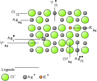 - un ion Cl− remplaçant un ion Ag+ (défaut d'antisite, très improbable) s'écrit ClAg′′ ou ClAg2′ ;