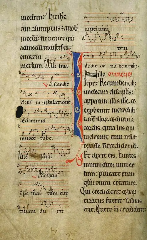 - notation ancienne d'Italie (ressemble à celle de Saint-Gall, mais caractérisée de l'allongement des neumes[nm 4])