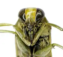 Tête de Notonecta maculata (en) montrant ses yeux composés et sa trompe.