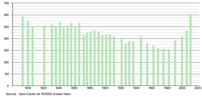 - ↑ Par convention dans Wikipédia, le principe a été retenu de n’afficher dans le tableau des recensements et le graphique, pour les populations légales postérieures à 1999, que les populations correspondant à une enquête exhaustive de recensement pour les communes de moins de 10 000 habitants, et que les populations des années 2006, 2011, 2016, etc. pour les communes de plus de 10 000 habitants, ainsi que la dernière population légale publiée par l’Insee pour l'ensemble des communes.