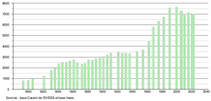L'évolution du nombre d'habitants est connue à travers les recensements de la population effectués dans la commune depuis 1793. Pour les communes de moins de 10 000 habitants, une enquête de recensement portant sur toute la population est réalisée tous les cinq ans, les populations de référence des années intermédiaires étant quant à elles estimées par interpolation ou extrapolation[33]. Pour la commune, le premier recensement exhaustif entrant dans le cadre du nouveau dispositif a été réalisé en 2005[34].