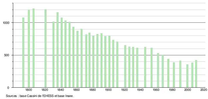 - ↑ Dans le tableau des recensements et le graphique, par convention dans Wikipédia, le principe a été retenu, pour les populations légales postérieures à 1999 de n’afficher dans le tableau des recensements et le graphique que les populations correspondant à l'année 2006, première population légale publiée calculée conformément aux concepts définis dans le décret no 2003-485 du 5 juin 2003, et les années correspondant à une enquête exhaustive de recensement pour les communes de moins de 10 000 habitants, ainsi que la dernière population légale publiée par l’Insee.