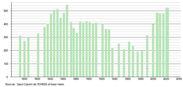 L'évolution du nombre d'habitants est connue à travers les recensements de la population effectués dans la commune depuis 1793. Pour les communes de moins de 10 000 habitants, une enquête de recensement portant sur toute la population est réalisée tous les cinq ans, les populations de référence des années intermédiaires étant quant à elles estimées par interpolation ou extrapolation[29]. Pour la commune, le premier recensement exhaustif entrant dans le cadre du nouveau dispositif a été réalisé en 2005[30].