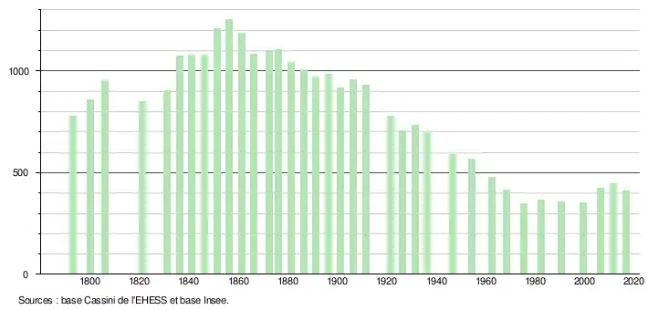 L'évolution du nombre d'habitants est connue à travers les recensements de la population effectués dans la commune depuis 1793. Pour les communes de moins de 10 000 habitants, une enquête de recensement portant sur toute la population est réalisée tous les cinq ans, les populations de référence des années intermédiaires étant quant à elles estimées par interpolation ou extrapolation[4]. Pour la commune, le premier recensement exhaustif entrant dans le cadre du nouveau dispositif a été réalisé en 2006[5].