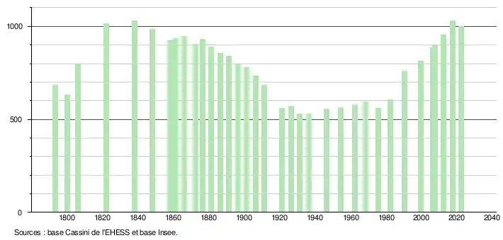 L'évolution du nombre d'habitants est connue à travers les recensements de la population effectués dans la commune depuis 1793. Pour les communes de moins de 10 000 habitants, une enquête de recensement portant sur toute la population est réalisée tous les cinq ans, les populations de référence des années intermédiaires étant quant à elles estimées par interpolation ou extrapolation[17]. Pour la commune, le premier recensement exhaustif entrant dans le cadre du nouveau dispositif a été réalisé en 2007[18].
