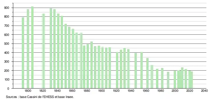 L'évolution du nombre d'habitants est connue à travers les recensements de la population effectués dans la commune depuis 1793. Pour les communes de moins de 10 000 habitants, une enquête de recensement portant sur toute la population est réalisée tous les cinq ans, les populations de référence des années intermédiaires étant quant à elles estimées par interpolation ou extrapolation[24]. Pour la commune, le premier recensement exhaustif entrant dans le cadre du nouveau dispositif a été réalisé en 2004[25].