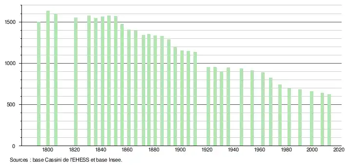 - ↑ Dans le tableau des recensements et le graphique, par convention dans Wikipédia, le principe a été retenu, pour les populations légales postérieures à 1999 de n’afficher dans le tableau des recensements et le graphique que les populations correspondant à l'année 2006, première population légale publiée calculée conformément aux concepts définis dans le décret no 2003-485 du 5 juin 2003, et les années correspondant à une enquête exhaustive de recensement pour les communes de moins de 10 000 habitants, ainsi que la dernière population légale publiée par l’Insee.