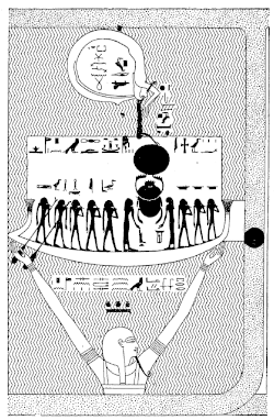 La barque solaire est l'élément principal de la scène. Elle apparaît dans un rectangle horizontal blanc qui contraste avec les vagues bleues de l'océan de Noun. Ce rectangle représente le monde créé et ordonné où évolue l'humanité, l'univers dirigé par Rê. La barque solaire symbolise cet ordre cosmique. Le voyage de la barque maintient en état le cosmos. Elle évoque aussi le Nil, le fleuve qui dispense la vie à l'Égypte. Le disque solaire est accompagné par plusieurs dieux garants de la Création ; Shou (souffle vital), Geb (la terre) et Heka (magie créatrice). Deux rames servent de gouvernail à la barque ; Hou (parole divine) et Sia (pensée créatrice) sont à la manœuvre. Rê est représenté sous la forme du disque solaire poussé par le scarabée Khépri. C'est le Soleil en devenir, qui va bientôt venir à l'existence en surgissant du monde nocturne et souterrain[b 3].