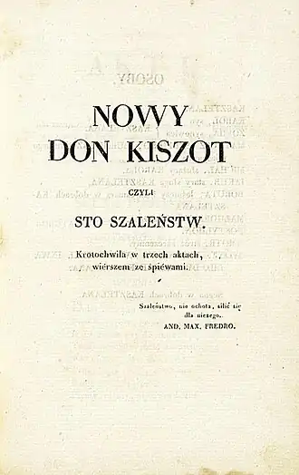 Nowy Don Kiszot czyli Sto szaleństw. Krotochwila we trzech aktach wierszem, ze śpiewami est une comédie en trois actes écrite par Aleksander Fredro en 1822.
