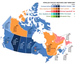 En , les partis d'opposition votent une motion de défiance envers le gouvernement Harper et des élections sont déclenchées. Après un début jugé en demi-teinte[23], la performance de Jack Layton dans les débats des chefs permet au NPD de connaitre une forte hausse dans les sondages, d'abord au Québec puis dans le reste du pays[24]. Au soir du scrutin, le NPD réussit à remporter 103 sièges, soit 67 de plus qu'à la précédente élection et repoussant les libéraux en troisième avec 34 sièges. Le NPD obtient 59 sièges au Québec, écrasant le Bloc québécois qui ne recueille que quatre sièges. Pour la première fois de son histoire, le NPD devient l'opposition officielle à la Chambre des communes.