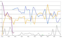 La région a longtemps été un bastion Whig (violet) puis Républicain (bleu), ces partis étant vus comme progressistes. Cependant, le tournant conservateur du Parti républicain a provoqué en 1964 à un raz-de-marée démocrate (jaune) pour Lyndon B. Johnson. Depuis 1992, la région est acquise aux démocrates lors des élections présidentielles.