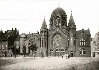 - ↑ Le style ésopien est le nom donné en Allemagne aux constructions, à la fin du XIXe et au début du XXe siècle, de synagogues dont l'aspect extérieur ne reflète en rien l'usage, à la différence des synagogues construites à peu près à la même époque en style néomauresque. Ces synagogues ésopiennes ont pour but de montrer l'intégration de la communauté juive dans la nation allemande.