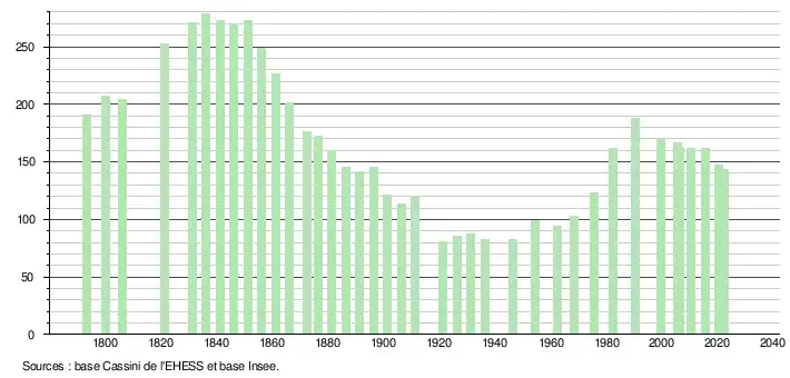 L'évolution du nombre d'habitants est connue à travers les recensements de la population effectués dans la commune depuis 1793. Pour les communes de moins de 10 000 habitants, une enquête de recensement portant sur toute la population est réalisée tous les cinq ans, les populations de référence des années intermédiaires étant quant à elles estimées par interpolation ou extrapolation[28]. Pour la commune, le premier recensement exhaustif entrant dans le cadre du nouveau dispositif a été réalisé en 2005[29].
