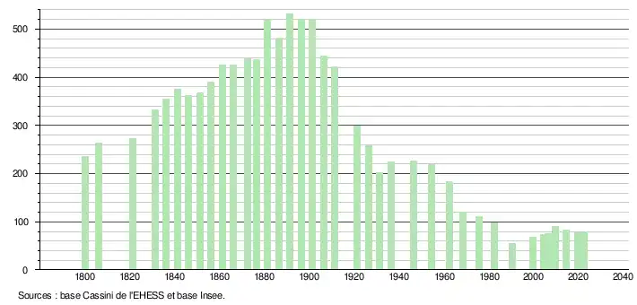 L'évolution du nombre d'habitants est connue à travers les recensements de la population effectués dans la commune depuis 1800. Pour les communes de moins de 10 000 habitants, une enquête de recensement portant sur toute la population est réalisée tous les cinq ans, les populations de référence des années intermédiaires étant quant à elles estimées par interpolation ou extrapolation[19]. Pour la commune, le premier recensement exhaustif entrant dans le cadre du nouveau dispositif a été réalisé en 2004[20].