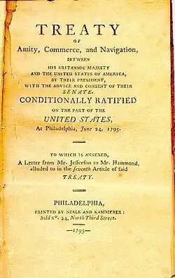 - 19 novembre : traité de Londres d'amitié, de commerce et de navigation entre les États-Unis et les Britanniques[4]. Il résout les différents à la frontière du nord ouest des États-Unis (ratifié en 1795).