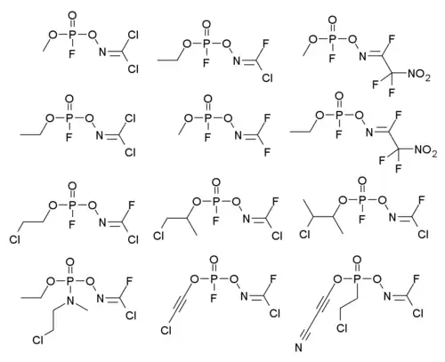 Un grand nombre de structures potentielles ont été publiées. Celles proposées par Hoenig présentent toutes un centre organophosphoré classique, parfois avec le groupe P=O remplacé par P=S ou P=Se, généralement présenté comme un phosphoramidate ou un phosphonate, le plus souvent fluoré, par exemple un monofluorophosphate PO3F2−. Les groupes organiques présentent une plus grande variabilité, mais avec en commun un substituant oxime de phosgène ou des structures analogues. Ceci confère à la molécule de puissantes propriétés vésicantes supposées accroître l'effet destructeur des agents Novitchok. Des auteurs affirment que ces molécules présentent en outre des motifs de réticulation susceptibles de se lier par covalence en plusieurs endroits du site actif de l'acétylcholinestérase, ce qui expliquerait la dénaturation rapide de l'enzyme, effet qui serait caractéristique des agents Novitchok.