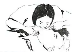 Si la victime ne respire pas ou si son cœur ne bat pas (ou du moins la victime semble être comme ça), il est nécessaire de faire rapidement une réanimation cardiopulmonaire (RCP) pour des victimes de la noyade (lire ci-dessous), qui est très similaire[26] à la réanimation normale. Et il est nécessaire d'appeler les services médicaux d'urgence quand ils n'ont pas encore été appelés (il y a une liste avec les numéros de téléphone d'urgence de différents pays ici). Aussi, il peut convenir d'envoyer quelqu'un demander un défibrillateur automatique externe (DAE ou DEA, AED en anglais) ou semi-automatique (DSA), s'il y en a un proche disponible (des défibrillateurs sont très fréquents aujourd’hui), au cas il est nécessaire. Système médical traditionnel pour expulser l'eau des poumons des victimes, actuellement inhabituel en général.Mais, si le sauveteur est complètement seul avec une victime sans respiration et sans battements, la séquence des mêmes actions serait ainsi: il ferait des manœuvres RCP (lire ci-dessous) au patient pendant 2 minutes (5 cycles de compressions et de ventilations); après cela, il appellerait des services médicaux d'urgence; à ce moment, il pourrait également rechercher un défibrillateur (DEA, DES ou DSA, AED en anglais) dans l'environnement (seulement si le défibrillateur peut être pris très rapidement) pour essayer de défibriller le patient s'il est it nécessaire (lire plus bas); ensuite, le sauveteur continuerait la réanimation ou commencerait la défibrillation. Le traitement médical traditionnel pour noyade pour des noyés commençait par expulser l'eau de leurs poumons avant de passer à la réanimation, en inclinant la victime face vers le bas (voir dessin à droite)[27]. Cependant, la gestion de le poids de son corps pourrait coûter du temps et des efforts, surtout si elle avait une lésion grave dans sa colonne vertébrale (à le cou ou le dos), ce qui nécessite plus de soins.