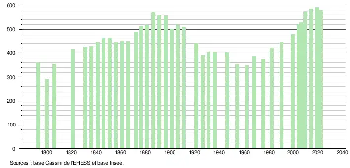 L'évolution du nombre d'habitants est connue à travers les recensements de la population effectués dans la commune depuis 1793. Pour les communes de moins de 10 000 habitants, une enquête de recensement portant sur toute la population est réalisée tous les cinq ans, les populations de référence des années intermédiaires étant quant à elles estimées par interpolation ou extrapolation[25]. Pour la commune, le premier recensement exhaustif entrant dans le cadre du nouveau dispositif a été réalisé en 2004[26].
