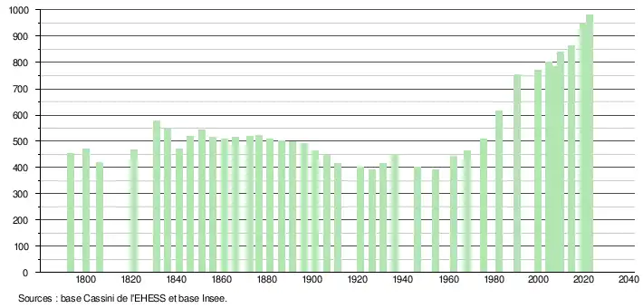 L'évolution du nombre d'habitants est connue à travers les recensements de la population effectués dans la commune depuis 1793. Pour les communes de moins de 10 000 habitants, une enquête de recensement portant sur toute la population est réalisée tous les cinq ans, les populations de référence des années intermédiaires étant quant à elles estimées par interpolation ou extrapolation[24]. Pour la commune, le premier recensement exhaustif entrant dans le cadre du nouveau dispositif a été réalisé en 2004[25].