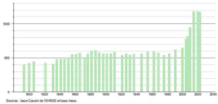 L'évolution du nombre d'habitants est connue à travers les recensements de la population effectués dans la commune depuis 1793. Pour les communes de moins de 10 000 habitants, une enquête de recensement portant sur toute la population est réalisée tous les cinq ans, les populations de référence des années intermédiaires étant quant à elles estimées par interpolation ou extrapolation[24]. Pour la commune, le premier recensement exhaustif entrant dans le cadre du nouveau dispositif a été réalisé en 2004[25].