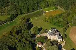 Le château de Brou fut bâti, selon une légende par le maréchal de Boucicaut[28] (Jean II Le Meingre, XVe siècle) mais plus sûrement par le Chevalier François de Gebert, Seigneur de Noyant et du Rivau[29]. Vers 1866-1868, M. le marquis de Moges fit faire des réparations importantes à ce château, sous la direction de M. de la Morandière, le même architecte qui construisit le viaduc de la Manse.