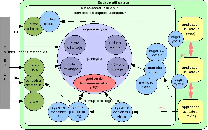 Un petit nombre de fonctions fondamentales est conservé dans un noyau minimaliste appelé « micronoyau ». L’ensemble des fonctionnalités habituellement proposées par les noyaux monolithiques est alors assuré par les services déplacés en espace utilisateur et par ce micro-noyau. Cet ensemble logiciel est appelé « micronoyau enrichi ».