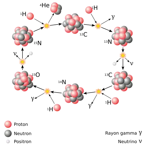 Le cycle carbone-azote-oxygène (CNO) est la principale source d'énergie des étoiles ayant une masse de 1,5 M⊙. Il produit moins de 10 % de l'énergie totale émise par le Soleil[4]. Dans cette chaîne complexe, quatre atomes d'hydrogène sont convertis en un atome d'hélium, alors qu'une fraction de la masse est transformée en énergie. Le cycle CNO nécessite une température d'au moins 20 millions de kelvin pour obtenir un rendement significatif[11].