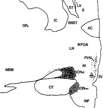 Le noyau supraoptique humain (SON, composants dorsolatéral et ventromédial) dans cette section coronale est indiqué par les zones ombrées. Les points représentent les neurones de la vasopressine (AVP) (également observés dans le noyau paraventriculaire, PVN). La surface médiale (à droite) est le 3e ventricule (3V)