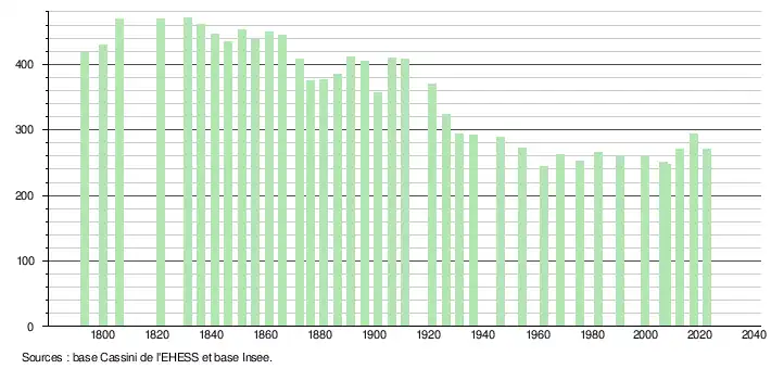 L'évolution du nombre d'habitants est connue à travers les recensements de la population effectués dans la commune depuis 1793. Pour les communes de moins de 10 000 habitants, une enquête de recensement portant sur toute la population est réalisée tous les cinq ans, les populations de référence des années intermédiaires étant quant à elles estimées par interpolation ou extrapolation[26]. Pour la commune, le premier recensement exhaustif entrant dans le cadre du nouveau dispositif a été réalisé en 2007[27].