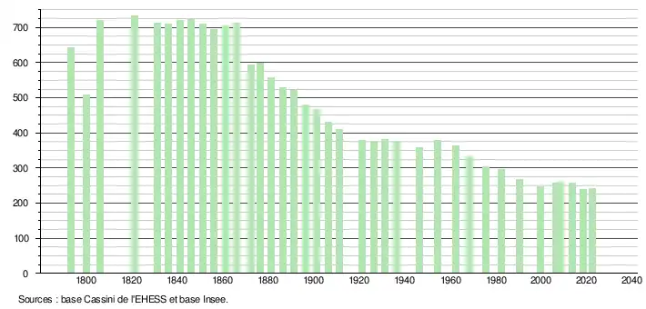 L'évolution du nombre d'habitants est connue à travers les recensements de la population effectués dans la commune depuis 1793. Pour les communes de moins de 10 000 habitants, une enquête de recensement portant sur toute la population est réalisée tous les cinq ans, les populations de référence des années intermédiaires étant quant à elles estimées par interpolation ou extrapolation[23]. Pour la commune, le premier recensement exhaustif entrant dans le cadre du nouveau dispositif a été réalisé en 2008[24].