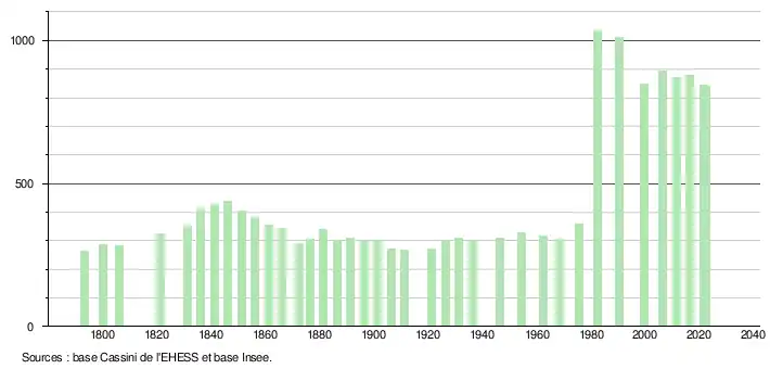 L'évolution du nombre d'habitants est connue à travers les recensements de la population effectués dans la commune depuis 1793. Pour les communes de moins de 10 000 habitants, une enquête de recensement portant sur toute la population est réalisée tous les cinq ans, les populations de référence des années intermédiaires étant quant à elles estimées par interpolation ou extrapolation[35]. Pour la commune, le premier recensement exhaustif entrant dans le cadre du nouveau dispositif a été réalisé en 2006[36].