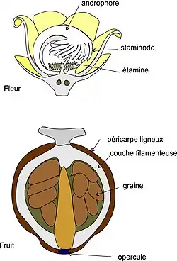 En haut de cet arbre poussent des inflorescences composées, d’environ 20 cm (en Guyane[9]) et jusqu’à 45 cm dans l’État de Pará (au Brésil[13]), en panicules, portant de petites fleurs d’un blanc jaunâtre. Chaque fleur hermaphrodite, à symétrie bilatérale (zygomorphes), possède un calice décidu, d’abord entier puis s’ouvrant en deux valves concaves, avec 2 à 3 lobes de 0,8-1,4 cm de long. La corolle odorante est formée de six pétales de 3 cm, d’une couleur allant du blanc au jaune canari et de nombreuses étamines fertiles et de staminodes, soudés à la base pour former un androphore[a] en forme d’un large capuchon [9], rabattu sur le pistil et étroitement appliqué au sommet de l'ovaire. Le capuchon hémisphérique de l’androphore ne porte que des staminodes rabattus vers l’intérieur (appelées ligule) alors que sa base porte une centaine d’étamines fertiles, à filet blancs et anthère jaune. L’ovaire infère, possède 4 loges à 4 à 6 ovules, soit en moyenne 20 ovules. Seulement 0,28 à 0,40 % des fleurs produisent des fruits[14].